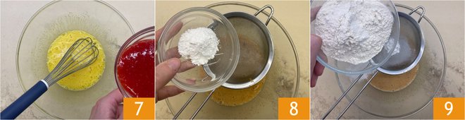 Also add the strawberry puree 7 and mix the batter with a whisk. Sift the baking powder 8 and flour 9 into the bowl.