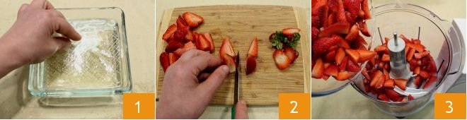 To prepare the strawberry mousse, start by soaking the gelatin sheets in cold water for at least 10 minutes 1. Wash the strawberries, remove the green stems, cut them in half 2, and place them in a blender 3; add the juice of a strained lemon and blend everything.