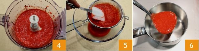 You should obtain a smooth puree 4, which you will then pass through a sieve 5 to remove any lumps and larger seeds: this will yield about 14 oz of strawberry puree. Take two/three tablespoons of strawberry puree and heat it in a saucepan 6,