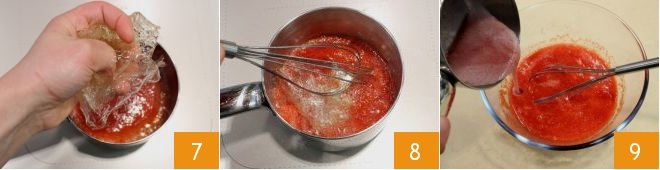 when it's hot add the drained and well-squeezed gelatin sheets 7 and let them dissolve completely by stirring with a whisk 8. Once the gelatin is completely dissolved, add the puree to the remaining one and mix well 9. Set the mixture aside while you continue with the preparation.