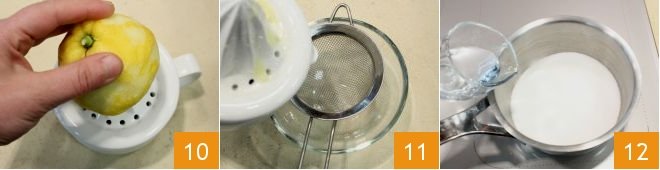 Now prepare the Italian Meringue: squeeze the juice of half a lemon and strain it (10-11). Then, in a small saucepan, dissolve the sugar with the water 12 over low heat;
