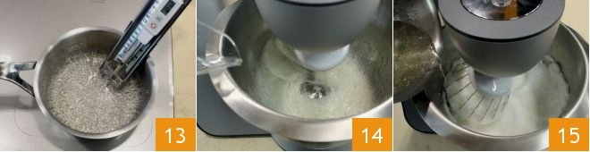 the syrup should not exceed 248°F (you'll need to measure with a kitchen thermometer); when the temperature reaches around 185°F, start working the egg whites with a stand mixer (or with an electric mixer) 13 and when they turn white, add the strained lemon juice 14. When the syrup reaches 248°F and at the same time the egg whites are well whipped, pour it slowly over the egg whites while continuing to work them at medium speed 15; continue to beat until the mixture becomes completely cool.