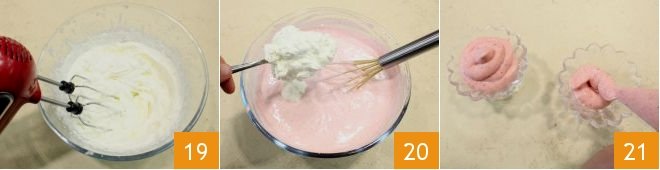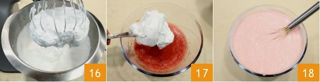 Once ready, the meringue will have a white and foamy consistency 14, add it to the strawberry puree 17 and mix with a whisk from top to bottom to keep the mixture from deflating 18.