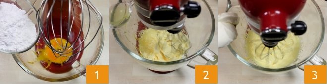 To prepare the strawberry tiramisu with limoncello cream, start with the mascarpone cream. In a stand mixer (or in a large bowl using an electric beater) pour the egg yolks and add the powdered sugar 1; then start the beaters. Then add the limoncello to the yolk and sugar mixture 2 and continue to beat the ingredients. Add the mascarpone to the mixture little by little 3.