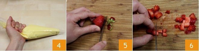 Once the cream is soft and frothy, transfer it to a piping bag 4 and put it in the refrigerator while you continue with the preparation. Wash the strawberries, keep 4 aside for decoration, while removing the green leaves from the others 5. Cut the strawberries into pieces 6.