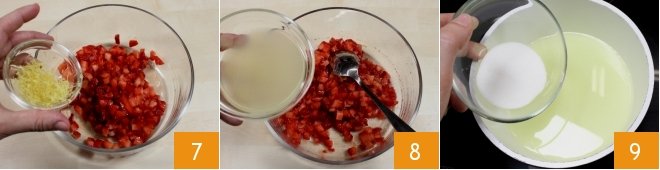 Collect them in a small bowl, pour the grated zest of an untreated lemon 7, the sugar, and the lemon juice 8. Leave the strawberries to marinate. Meanwhile, prepare the syrup: in a saucepan pour the water, then the limoncello, and then add the sugar 9.