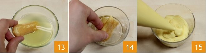 Let the syrup cool and transfer it to a small bowl. Now you can start assembling your tiramisu: take the ladyfingers, divide them in half before quickly dipping them in the now cold syrup 13; then transfer them into the 6.5 fl oz glasses 14 (if you don't have them, you can use a single rectangular or round mold of about 2 qt). Place two halves of soaked ladyfinger on the bottom, cover them with a layer of cream using the piping bag 15.