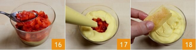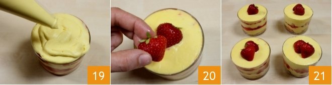 Then cover with a layer of strawberries 16 and make them adhere well to the sides of the glasses for a better visual effect. Cover again with the cream 17, then start again with half a ladyfinger 18,