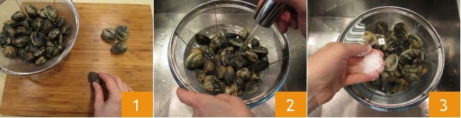 To prepare strozzapreti with seafood, start with the How to clean clams. Tap them on a cutting board, one by one, to ensure they are intact and not filled with sand. If you find any broken clams, discard them 1. Then soak them in a bowl full of fresh water 2 and add plenty of salt to recreate seawater. Let them purge for a couple of hours; before using them, make sure none are open, otherwise, discard them, and then rinse 3.