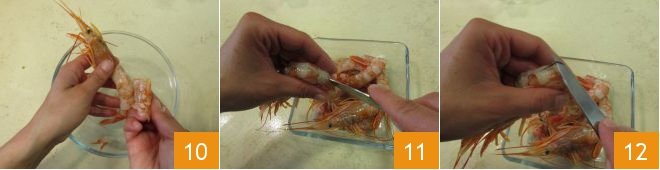 Finally, also clean the How to clean shrimp. Remove the legs and the shell on the back, leaving the rest intact 10. Then cut the back 11 and remove the intestine, that black filament you will see 12.
