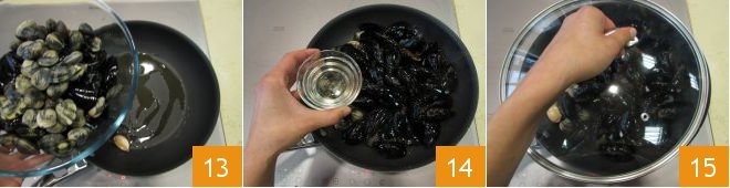 Place a pan on the heat, heat a splash of oil and a clove of garlic in its skin. Then add mussels and clams 13, immediately pour in 50 g of wine 14, and cover with a lid 15.