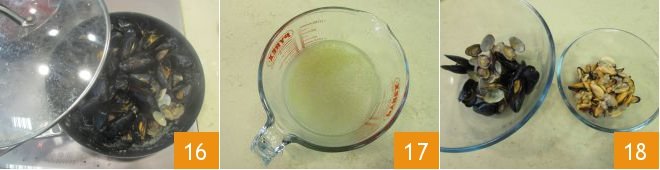 Shake the pan occasionally and let the bivalves open completely, it will take about 5 minutes 16. Once ready, drain them, keeping the cooking liquid aside 17, and then start shelling almost all the seafood, keeping some whole for decoration 18.