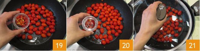 Put a saucepan on the heat, heat a drop of oil, add the whole cherry tomatoes, and add the crumbled dry chili pepper 19, then very little water, about a tablespoon, 20. Cover with the lid and let cook at low temperature for 15 minutes, shaking the pan occasionally 21.