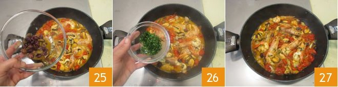 Add the olives 25 and chopped parsley 26. Continue cooking for another 20 minutes, stirring occasionally and letting the sauce reduce a little: add more mussel and clam broth if necessary 27.