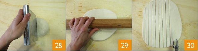 In the meantime, you can roll out the pasta. Divide the rested dough into two 28, then roll out the first half with the rolling pin until you get a sheet about 1 mm thick 29. Then, with a smooth wheel, cut to get strips about 1 inch wide 30.