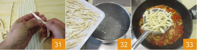 Tightly twist the bigoli slightly to obtain the strozzapreti 31. Gradually place the pasta on floured trays. When all are ready, cook the strozzapreti by pouring them into a pot with boiling salted water 32. As soon as the pasta is al dente, drain it directly into the sauce 33.
