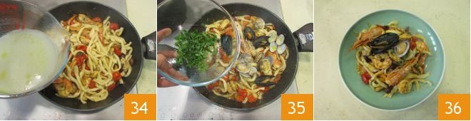 Then add a splash of mussel and clam cooking water 34, so you can toss the pasta. Finally, with the heat off, add a drizzle of oil again and a bit of chopped parsley 35. Mix and serve your strozzapreti with seafood 36.