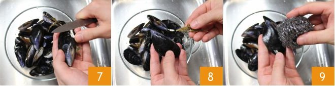 While the pasta rests, move on to the How to Clean and Open Mussels. Use a smooth-bladed knife to detach the volcanic-shaped encrustations on the shells 7, then remove the byssus, or the filamentous part 8, and finally scrape away the impurities with a scourer; rinse them under a stream of fresh water 9.