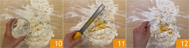 Now flavor with the anise liqueur 10, lemon zest 11, and orange zest, both grated. Start working the dough with your hands or with the help of a dough scraper 12.