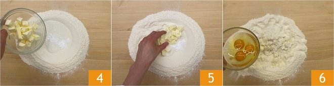 Cut the butter into cubes and place it in the center 4. Start kneading with your hands 5, then pour in the first 2 eggs 6.