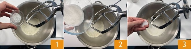 To prepare the stuffed Carnival pastries, place the sifted flour and baking powder in the bowl of a stand mixer fitted with a paddle attachment 1. Add a teaspoon of vanilla extract, the sugar 2, and a pinch of salt 3.