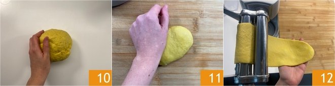 Transfer the dough to a work surface and knead it quickly with your hands to form a ball 10. Wrap the dough in plastic wrap and let it rest for 30 minutes at room temperature. After this time, divide the dough into small pieces of about 5 1/4 oz (150 g) each, flatten them slightly on the floured surface 11, and pass them one at a time through the pasta machine on the first setting 12. Meanwhile, keep the others covered with plastic wrap.