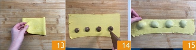 Fold each sheet into 3 13, then roll it again starting from the widest setting and progressively reducing it to the penultimate setting, passing it through twice. Let the rolled dough rest for a few minutes at room temperature, then using a piping bag, form small mounds of filling, placing them 1 1/4 inches (3 cm) apart and leaving 1/3 inch (1 cm) free from the bottom edge 14. Then fold over the top edge 15 to cover the filling, as you would for ravioli.
