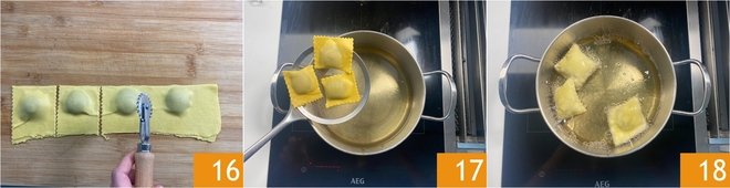 With your fingers, press down well around the mounds of filling to adhere the sheets, then with a fluted pastry wheel, trim the edges and cut into squares 16. Continue in this way until all ingredients are used; you'll get about 20 pastries with Nutella and 20 with jam. Move on to frying: heat the oil in a large pot to reach 340°F (170°C). When it reaches this temperature, immerse 4 or 5 stuffed pastries at a time 17, turning them on both sides for even cooking 18.
