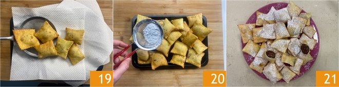 When they are golden, drain the Carnival pastries with a slotted spoon and transfer them to paper towels 19; let them cool completely, then sprinkle them with a generous dusting of powdered sugar 20. Your stuffed Carnival pastries are ready to be served and enjoyed 21!