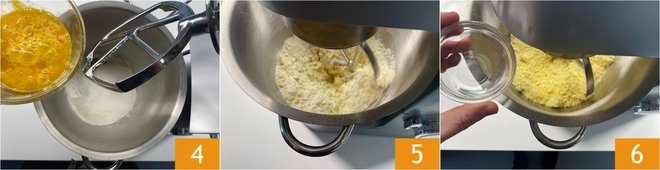 In a small bowl, beat together the eggs and egg yolk; then pour them into the mixer while it's running 4. Knead at medium speed 5 and when the eggs are well absorbed, add the grappa 6.