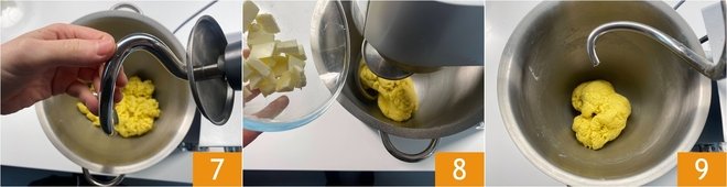 Work everything for 10 minutes until you get a homogeneous and pliable dough; if it seems too compact, you can add 5-10 ml of water. Stop the mixer and replace the paddle with the dough hook 7. Add the butter in small pieces gradually 8 and continue working until you get a smooth dough 9.