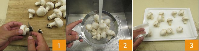 To make the stuffed champignon mushrooms with sausage, first clean the mushrooms: cut off the earthy base of the stem 1. If very dirty, you can rinse them quickly (be careful because mushrooms absorb water easily, which can ruin them) 2 and dry them well but gently with a cloth 3 to remove all soil residues.
