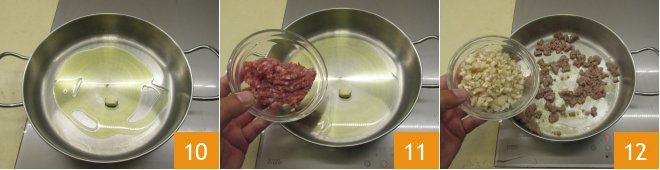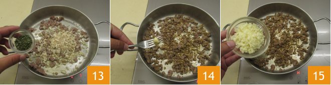 Heat a drizzle of oil in a pan with a peeled garlic clove 10, when the oil is hot add the sausage 11 and let it brown for 3-4 minutes, then add the mushroom stems 12, season with salt and pepper.
