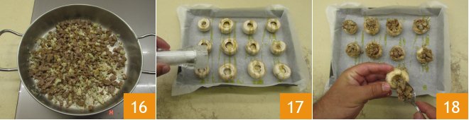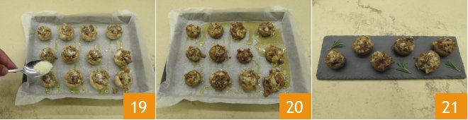 Stir to combine the flavors; the filling is ready 16. Oil and salt the champignon caps previously placed on a baking sheet lined with parchment paper 17, stuff them with the sausage and provolone filling 18.
