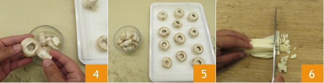 Detach the stems carefully, without breaking or snapping the mushroom cap 4, and keep them separate 5. Chop the provolone cheese 6.