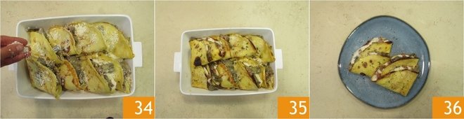 Gradually arrange the crepes in a baking dish, then add some grated Parmesan. Bake at 200°F (93°C) in grill mode for about 5 minutes, or until the crepes are well gratinated. Remove from the oven, add fresh thyme 35, and serve immediately 36.