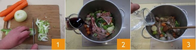To prepare the Tuscan-style stuffed lamb shoulder, start with the meat broth. Debone the lamb shoulder and remove all the fat. Roughly chop the celery, carrot, and onion 1 and place them in a large pot along with the bones. Cook on high heat for 3-4 minutes, then deglaze with the red wine 3. Pour in the water 4,