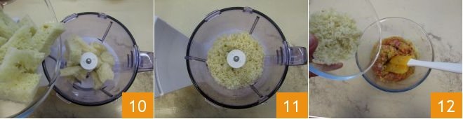 Put the bread crumbs in a mixer with blades 10 and blend everything 11, then add it to the sausage and vegetable mixture 12