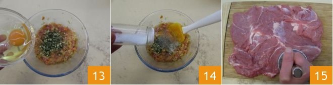 along with an egg and part of the chopped aromatic mix 13. Season with salt and pepper 14 and mix to blend all the ingredients well. Take the lamb shoulder and pound it well with a meat mallet 15;