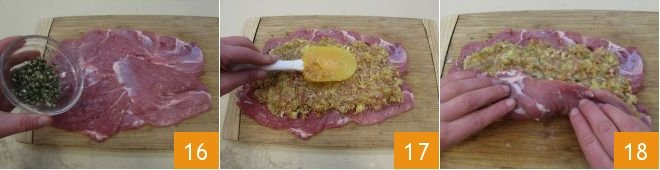 sprinkle it with the garlic and aromatic mixture you prepared 16, season with salt and pepper, then spread the meat and vegetable filling evenly 17. With your hands, roll up the meat 18