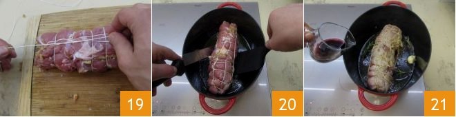 and How to tie a roast to prevent the filling from spilling out during cooking 19. In a pan, pour 2 tbsps of oil and the remaining garlic clove, place the lamb shoulder 20 and brown it well on both sides along with a sprig of rosemary, then deglaze with the red wine 21.