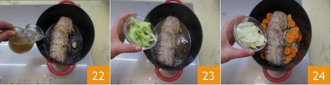 Pour in the broth you prepared 22 and the roughly chopped vegetables (23-24).