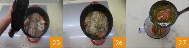 Cover with a lid 25 and let cook over moderately low heat for about 1 hour, adding broth when necessary. Once cooked 26, place the cooking liquid and vegetables in a tall container 27