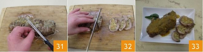 At this point, remove the tying twine 31 and cut the lamb shoulder into slices 32; place the slices on a serving dish, drizzling them with the accompanying sauce, and serve your Tuscan-style stuffed lamb shoulder hot 33.