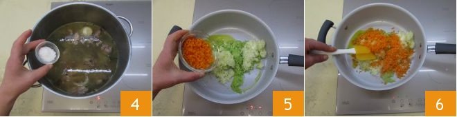 add the salt 4 and pepper, and cook on low heat for 1 hour. Meanwhile, prepare the filling. Finely chop the carrot, celery, and onion; sauté them in a non-stick saucepan with 2 tbsps of olive oil 5, stirring with a kitchen spatula 6. Once done, turn off the heat and let them cool slightly.