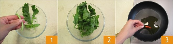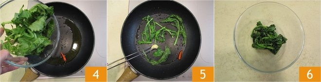 Add the turnip greens 4 and let them wilt over medium heat for about 5 minutes 5. Add the salt, remove the garlic, and transfer to a small bowl 6, keeping the pan aside to toast the bread. Then take the chili pepper and slice it thinly.