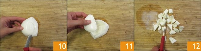 Now, with the help of a small knife, cut the central part of the PDO mozzarella creating a cone-shaped hole 10. Extract the piece of mozzarella 12 and cut it into small cubes 13.