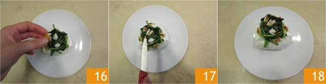 Fill the PDO mozzarella with the turnip greens 13 and mozzarella cubes 14. Transfer to a serving plate 15.