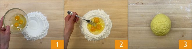To prepare the stuffed pappardelle with rabbit ragù, start with the fresh pasta. On a work surface, arrange the flour in a mound 1, crack the eggs into the center, beat them quickly 2, and knead until you obtain a smooth and homogeneous dough 3. Wrap it in plastic wrap and let it rest in the fridge for 30 minutes.