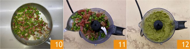 Add the peas 7, season with salt and pepper 8. Cover the pan with a lid 9 and cook for 15 minutes.